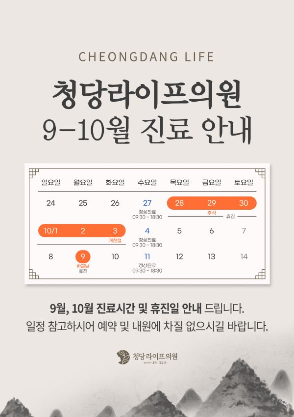 청당라이프의원 9-10월 진료 안내